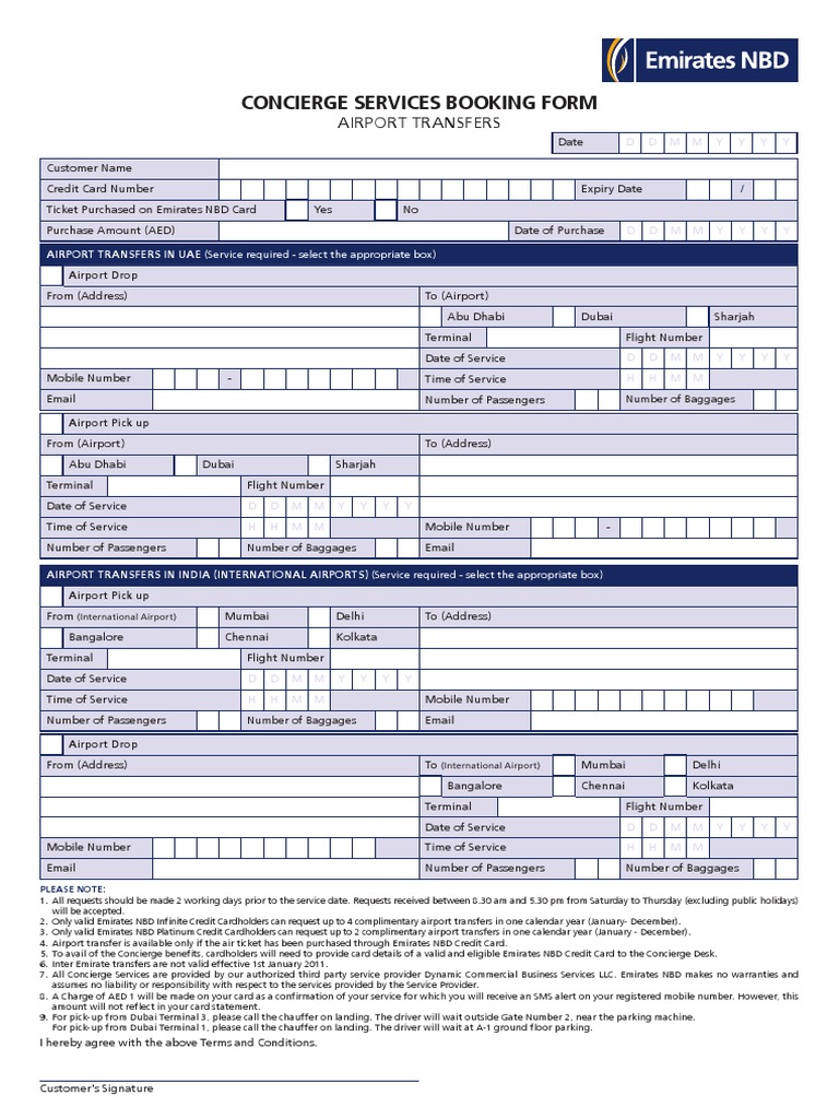 Concierge Services Booking Form Airport Transfer Credit Card
