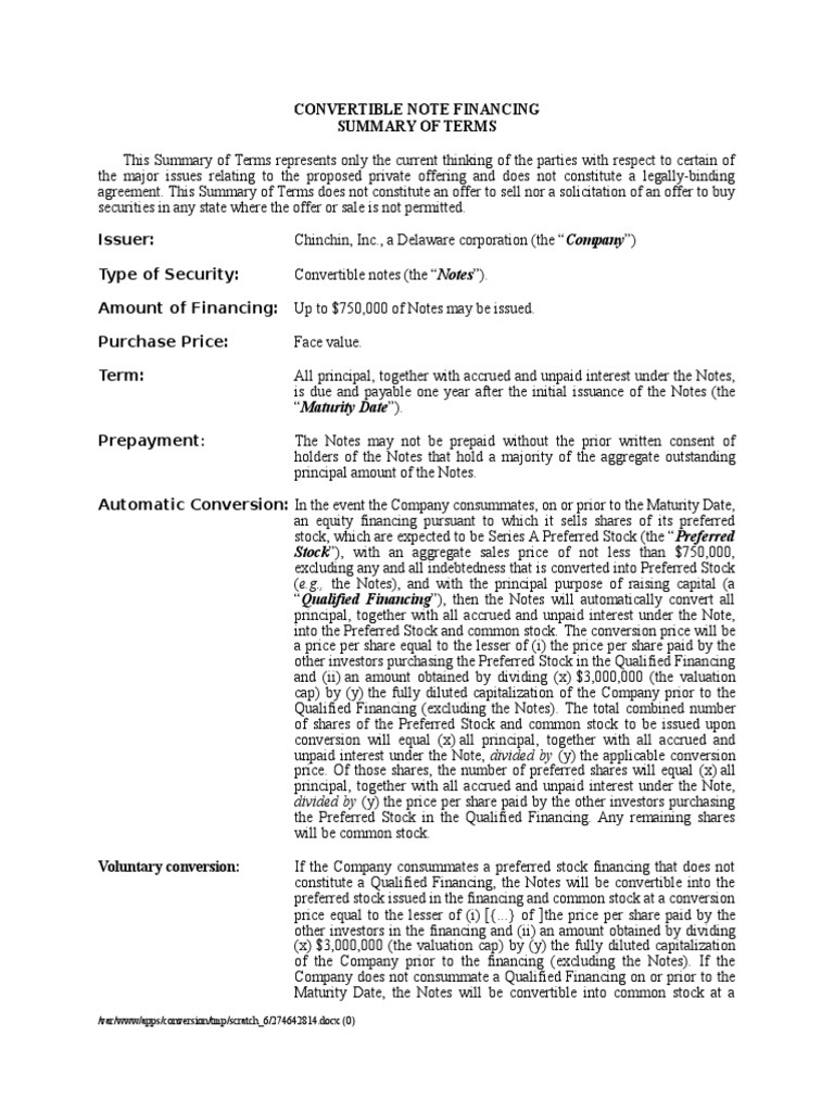 Convertible Note Term Sheet Bonds (Finance) Preferred Stock