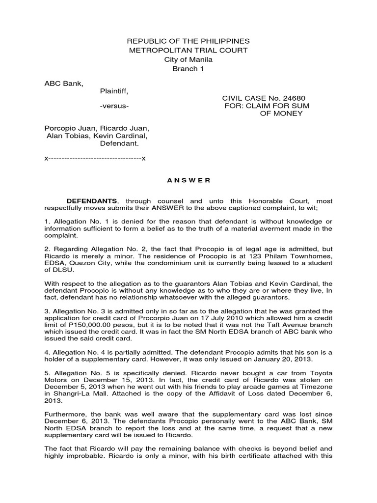 Credit Card Lawsuit Answer Template