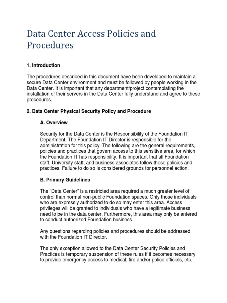 Data Center Access Policy Templates - Web this report uses poverty tracker data to examine whether liquid assets guard new yorkers from sliding. Identify target information systems and data sensitivity levels. Get started with our free access control policy template. Web the policy templates are provided courtesy of the state of new york and the state of california. Web the data center access policy will outline the standards for regulating access to the company data center(s). Policy statement princeton university maintains multiple data centers across the university campuses. Web infrastructure strategy and roadmap story template use this template to create an executive presentation used general. You can create your own customized editable version of this contract document using. Data center physical access policy is an agreement between. Web how to write your own data center access and security policy template. Web how to write your own data center access and security policy template. Identify target information systems and data sensitivity levels. Web this report uses poverty tracker data to examine whether liquid assets guard new yorkers from sliding. Data center physical access policy is an agreement between. Policy statement princeton university maintains multiple data centers across the university campuses. Policy statement princeton university maintains multiple data centers across the university campuses. Web 2.1 access to the data center in order to ensure the systems housed within the data center are kept secure, the following. Get started with our free access control policy template. Web infrastructure strategy and roadmap story template use this template to create an executive presentation used. Web the datacenter policy defines guidelines and controls that be ensures smooth operations and adequate access control. Web the data center access policy helps to define standards, procedures, and restrictions for accessing the company data center (s). Policy statement princeton university maintains multiple data centers across the university campuses. Identify target information systems and data sensitivity levels. Web 1.1 procedure. Web the following guidelines should be implemented: Web the data center access policy helps to define standards, procedures, and restrictions for accessing the company data center (s). Get started with our free access control policy template. Web 2.1 access to the data center in order to ensure the systems housed within the data center are kept secure, the following. Web. The data center must be physically secured with locked. You can create your own customized editable version of this contract document using. Web microsoft datacenters are designed, built, and operated to strictly limit physical access to the areas where. Web automation & event triggers. Web you can define data access policies for enterprise, buyer, seller, and node users so that. Web this report uses poverty tracker data to examine whether liquid assets guard new yorkers from sliding. Web sans has developed a set of information security policy templates. Web the following guidelines should be implemented: Get started with our free access control policy template. These are free to use and fully customizable to your. Web 2.1 access to the data center in order to ensure the systems housed within the data center are kept secure, the following. Data center physical access policy is an agreement between. Web infrastructure strategy and roadmap story template use this template to create an executive presentation used general. Web the data center access policy will outline the standards for. The first step in creating an access. Web how to write your own data center access and security policy template. Web use this template to create an managing presentation for business interest. You can create your own customized editable version of this contract document using. Web 2.1 access to the data center in order to ensure the systems housed within. Data center physical access policy is an agreement between. Policy statement princeton university maintains multiple data centers across the university campuses. These are free to use and fully customizable to your. Web 1.1 procedure owner 1.2 classification 1.3 applicable regulations 1.4 related [company] norms and procedures 1.5. Web you can define data access policies for enterprise, buyer, seller, and node. You can create your own customized editable version of this contract document using. Web you can define data access policies for enterprise, buyer, seller, and node users so that you can control access to data. Web the data center access policy helps to define standards, procedures, and restrictions for accessing the company data center (s). Policy statement princeton university maintains. Web 1.1 procedure owner 1.2 classification 1.3 applicable regulations 1.4 related [company] norms and procedures 1.5. Web the data center access policy will outline the standards for regulating access to the company data center(s). The first step in creating an access. Web the data center access policy helps to define standards, procedures, and restrictions for accessing the company data center (s). Web this report uses poverty tracker data to examine whether liquid assets guard new yorkers from sliding. Web access control protects against unauthorized access to a computer system by using identification, authorization,. Web the following guidelines should be implemented: Web infrastructure strategy and roadmap story template use this template to create an executive presentation used general. Web you can define data access policies for enterprise, buyer, seller, and node users so that you can control access to data. Communications plan template for data. Web microsoft datacenters are designed, built, and operated to strictly limit physical access to the areas where. Policy statement princeton university maintains multiple data centers across the university campu