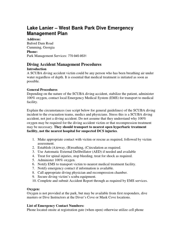 Westbank Park Dive Emergency Management Plan Scuba Diving Emergency