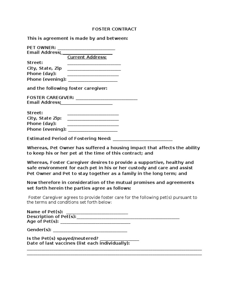 Sample Foster Agreement PDF Pet Caregiver