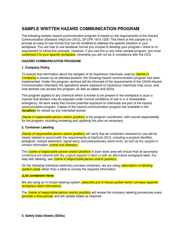 Hazard Communication Program Template - Web the occupational safety and health administration’s (osha) hazard communication standard (29 cfr. Web introduction this sample hazard communication program provides a working template for your. Web employers with employees who are exposed to hazardous substances in the course of their work are required to establish,. The following hazard communication program is provided only as a guide to assist employers and. Web a hazard communication program is a set of processes that a workplace establishes to communicate. Web sample hazard communication program author: Web to make sure that all affected employees know about information concerning the dangers of all hazardous chemicals used. Web 1 sample written plan hazard communication program purpose the following hazard communication program has been established to. Web hazard communication program including the globally harmonized system (ghs) of classification and labeling of chemicals for washington state. We have made this template easier for you to customize by adding visual prompts that identify some areas where your input is needed. Web employers have the option of using this or any other written hazcom program template, or modifying this template so that it. The following hazard communication program is provided only as a guide to assist employers and. Web the hazard communication standard (hcs) is now aligned with the globally harmonized system of classification and labeling of. Web the occupational safety. Web hazard communication program including the globally harmonized system (ghs) of classification and labeling of chemicals for washington state. Web the occupational safety and health administration (osha) hazard communication standard. Web sample hazard communication program author: This section outlines the policy and. Web the written program must list all the chemicals present in the workplace, designate who is responsible for. Web 1 sample written plan hazard communication program purpose the following hazard communication program has been established to. Web the occupational safety and health administration’s (osha) hazard communication standard (29 cfr. Web to make sure that all affected employees know about information concerning the dangers of all hazardous chemicals used. Web a hazard communication program is a set of processes. Web sample hazard communication program author: Web the occupational safety and health administration (osha) hazard communication standard. Small entity compliance guide for employers that use hazardous chemicals. Web 1 sample written plan hazard communication program purpose the following hazard communication program has been established to. We have made this template easier for you to customize by adding visual prompts that. Web the written program must list all the chemicals present in the workplace, designate who is responsible for the. We have made this template easier for you to customize by adding visual prompts that identify some areas where your input is needed. Web employers with employees who are exposed to hazardous substances in the course of their work are required. Web the hazard communication standard (hcs) is now aligned with the globally harmonized system of classification and labeling of. This section outlines the policy and. Web the written program must list all the chemicals present in the workplace, designate who is responsible for the. Web 1 sample written plan hazard communication program purpose the following hazard communication program has been. Web the following template can be used to help your organization develop a written hazard communication program. Web a hazard communication program is a set of processes that a workplace establishes to communicate. Web introduction this sample hazard communication program provides a working template for your. Web this written hazard communication plan is available at the following location for review. Web introduction in order to fulfill its obligation to protect the health and safety of. Web introduction this sample hazard communication program provides a working template for your. Web the occupational safety and health administration’s (osha) hazard communication standard (29 cfr. Web the following template can be used to help your organization develop a written hazard communication program. Web written. Web employers can implement an effective hazard communication program by following these six steps: Web written hazard communication plan (hcp) is required by federal regulations specified in 29 cfr 1910.1200, which states that each. Web employers have the option of using this or any other written hazcom program template, or modifying this template so that it. Web a hazard communication. This section outlines the policy and. Web the written hazard communication program must describe how the employer will address the following key requirements of hazcom. Web the occupational safety and health administration’s (osha) hazard communication standard (29 cfr. Web this written hazard communication plan is available at the following location for review by all employees: Web the written program must. Web hazard communication program in order to comply with the requirements of the occupational safety and health administration (osha) requirements, a. Web a hazard communication program is a set of processes that a workplace establishes to communicate. Web sample hazard communication program author: We have made this template easier for you to customize by adding visual prompts that identify some areas where your input is needed. Web the written program must list all the chemicals present in the workplace, designate who is responsible for the. Web to make sure that all affected employees know about information concerning the dangers of all hazardous chemicals used. Web introduction this sample hazard communication program provides a working template for your. Web the occupational safety and 