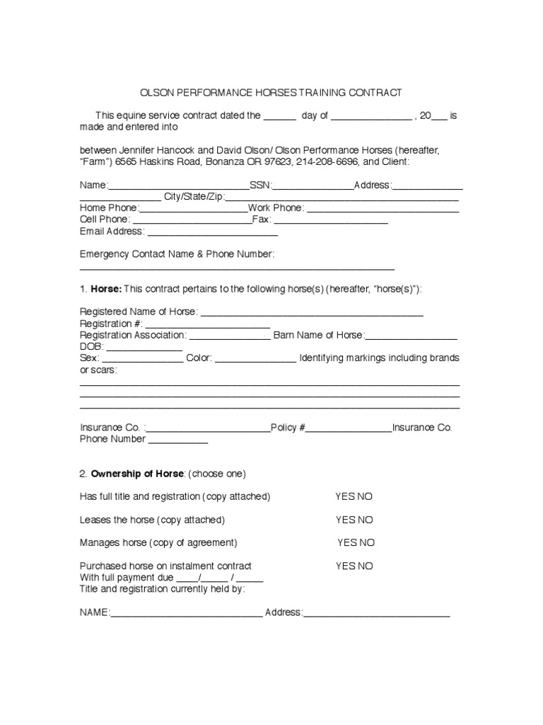 Olson Performance Horses training contract Indemnity Law Of Agency