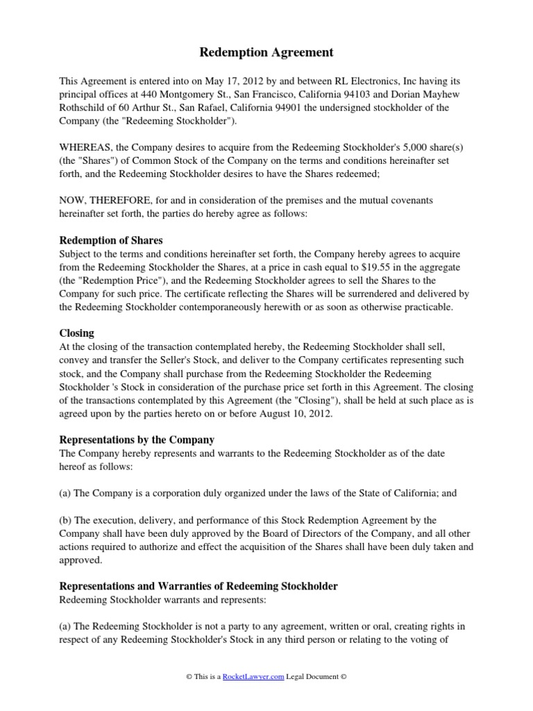 Free Redemption Agreement Make & Download Rocket Lawyer