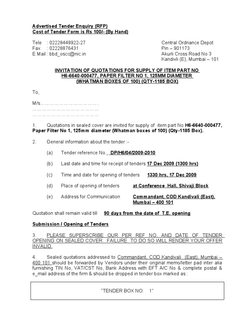 Advertised Tender Enquiry (RFP) Cost of Tender Form is Rs Contractual