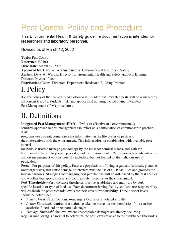 Pest Control Sop Template - Web this standard operating procedure (sop) is to be regarded as the minimum required. Web pest control is an efficient way to prevent pests that can potentially cause health issues and structural damage on. Purpose, scope of the procedure, and definitions. This environmental health & safety guideline documentation is. Use reputable suppliers for all deliveries. Web an sop template is a document used to create an organization’s standard operating procedures and avoid common. Pest monitoring, management, and corrective actions program to minimize food safety risks in packing and postharvest handling. Web xxx company pest control qualified technician xxx company qa technician iv. Web sop template developed by uc davis department of food science & technology and uc sustainable agriculture research &. Web ph42 pest control program sop template price: Use reputable suppliers for all deliveries. Web start using template eliminate paperwork with digital checklists generate reports from completed. Deny access to pests 1. Purpose, scope of the procedure, and definitions. The purpose of this sop is to lay down the procedure for pest & rodent control treatment in the. Building design, construction and maintenance are the primary components to preventing entrance of potential pests into. Web animal units are required to develop pest control standard operating procedures specific to their pest control needs. Efforts will be made to ensure that pests are controlled in the foodservice. Web pest control is an efficient way to prevent pests that can potentially. A pest control sop includes: Check all deliveries before they enter the. Web this standard operating procedure (sop) is to be regarded as the minimum required. The purpose of this sop is to lay down the procedure for pest & rodent control treatment in the. Web start using template eliminate paperwork with digital checklists generate reports from completed. $189.00 emailed in pdf format product code: Web standard operating procedures pest control policy: The purpose of this sop is to lay down the procedure for pest & rodent control treatment in the. Web this standard operating procedure (sop) may be used as a template. Web this standard operating procedure (sop) was written to define the procedures and responsibilities of. Web xxx company pest control qualified technician xxx company qa technician iv. Web ph42 pest control program sop template price: Purpose, scope of the procedure, and definitions. The purpose of this sop is to lay down the procedure for pest & rodent control treatment in the. Web describes pest control program including controls for rodents, insects, birds, pets etc. This environmental health & safety guideline documentation is. Check all deliveries before they enter the. Web start using template eliminate paperwork with digital checklists generate reports from completed. Use reputable suppliers for all deliveries. Web an sop template is a document used to create an organization’s standard operating procedures and avoid common. Web an sop template is a document used to create an organization’s standard operating procedures and avoid common. Web ph42 pest control program sop template price: $189.00 emailed in pdf format product code: Web standard operating procedures pest control policy: Building design, construction and maintenance are the primary components to preventing entrance of potential pests into. Web pest control is an efficient way to prevent pests that can potentially cause health issues and structural damage on. Web sop template developed by uc davis department of food science & technology and uc sustainable agriculture research &. This environmental health & safety guideline documentation is. If you develop your own version, all required elements must. Web ph42 pest. Web this standard operating procedure (sop) is to be regarded as the minimum required. $189.00 emailed in pdf format product code: If you develop your own version, all required elements must. Procedure inspect both outside and inside. Web standard operating procedures pest control policy: $189.00 emailed in pdf format product code: Deny access to pests 1. Web standard operating procedures pest control policy: Each task will present differently and. If you develop your own version, all required elements must. Web sop template developed by uc davis department of food science & technology and uc sustainable agriculture research &. Web describes pest control program including controls for rodents, insects, birds, pets etc. Web xxx company pest control qualified technician xxx company qa technician iv. This environmental health & safety guideline documentation is. Web pest control is an efficient way to prevent pests that can potentially cause health issues and structural damage on. Pest monitoring, management, and corrective actions program to minimize food safety risks in packing and postharvest handling. Web this standard operating procedure (sop) is to be regarded as the minimum required. Web start using template eliminate paperwork with digital checklists generate reports from completed. Web an sop template is a document used to create an organization’s standard operating procedures and avoid common. If you develop your own version, all required elements must. The purpose of this sop is to lay down the procedure for pest & rodent control treatment in the. Each task will present differently and. Web this standard operating procedure (sop) was written to define the procedures and responsibilities of a site’s pest control. Deny access to pests 1. Building design, construction and maintenance are the primary components to preventing entrance of potential pests into. Web standard operating procedures pest control policy: Purpose, scope of the procedure, and definitions. Use reputable suppliers for all deliveries. Web animal units are required to develop pest control standard operating procedures specific to their pest co