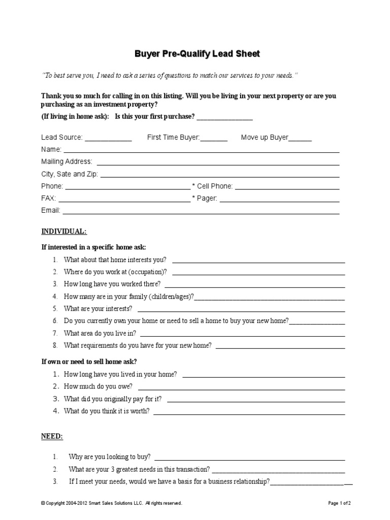Buyer Lead Sheet Fill Online, Printable, Fillable, Blank pdfFiller