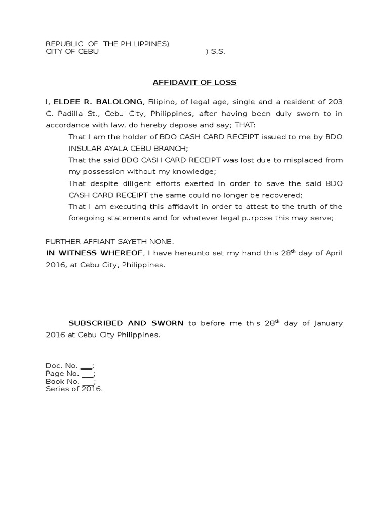 Sample Affidavit Of Loss Atm Card Classles Democracy