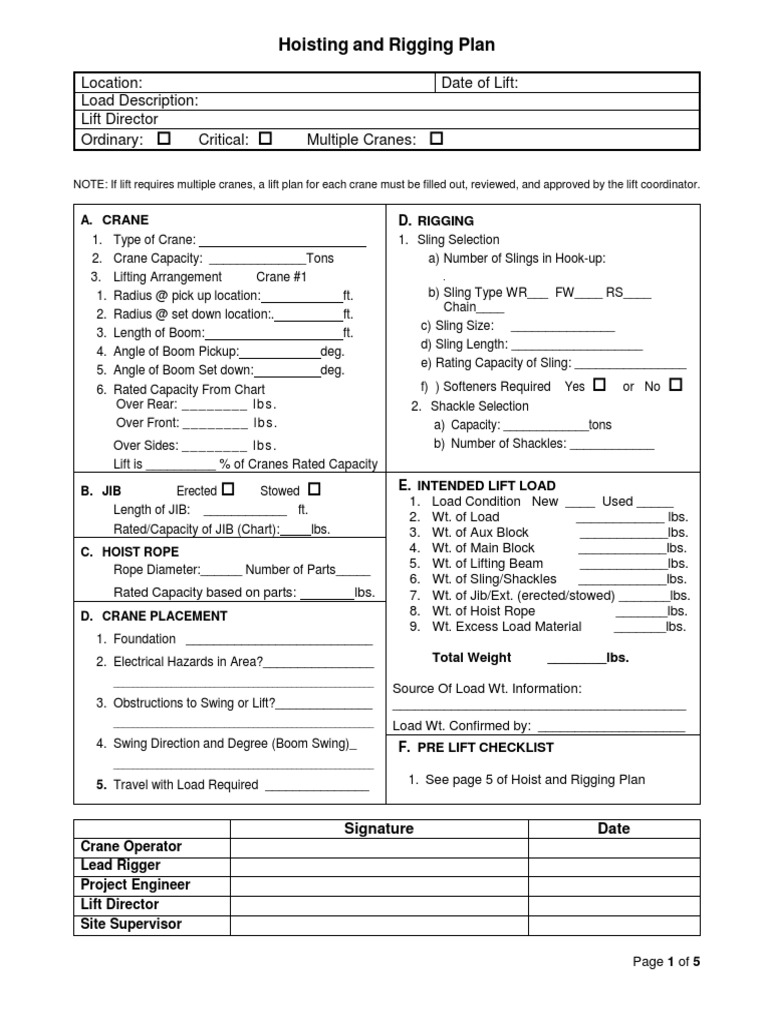 Rigging Plan Template - Web download now of 3 brookhaven national laboratory rigging plan worksheet building #: Web sample template for lifting plan & rigging study % usage of crane. • in short, a rigging plan in accordance with ansi/asse a10.48 is required for all. Depending upon the kind of lift, at that point. Web general information lift plan document # plan prepared by: Web the basic rigging plan plan every lift, include the following questions with the questions your experience provides: Web when starting a new rigging plan choose the hoist(s) and block(s) on the menu sheet using the drop down boxes located just. Web from the calculations in the rigging plan, you can get the percentage between the load lifted and the desired. Web this form is used to document the lift plan required for ordinary lifts. Web a rigging plan is required for every lift at a site and a qualified person needs to understand the math that is creating forces on every lift. But first, one needs to know the definitions: Depending upon the kind of lift, at that point. Web a rigging plan is required for every lift at a site and a qualified person needs to understand the math that is creating forces on every lift. 2) sketch heel block attachment configuration. Web the purpose of this document is to discuss. Web there are three main classifications of lifting plans: • in short, a rigging plan in accordance with ansi/asse a10.48 is required for all. Web this form is used to document the lift plan required for ordinary lifts. Riggingcalc is the only rigging plan generator accepted by all major tower owners. Web a rigging plan template is a document that. Web the basic rigging plan plan every lift, include the following questions with the questions your experience provides: A force is a push or pull upon an object resulting from the object’s interaction with another object. • in short, a rigging plan in accordance with ansi/asse a10.48 is required for all. Web sample template for lifting plan & rigging study. Web rigging hardware wire rope clips & turnbuckles; Depending upon the kind of lift, at that point. Web sample template for lifting plan & rigging study % usage of crane. Web this form is used to document the lift plan required for ordinary lifts. Web general information lift plan document # plan prepared by: Boom length (m) pick up radius (m) drop. A force is a push or pull upon an object resulting from the object’s interaction with another object. The plan must be approved by someone with knowledge and experience in hoisting. Web sample template for lifting plan & rigging study % usage of crane. Web there are three main classifications of lifting. Riggingcalc is the only rigging plan generator accepted by all major tower owners. Web the purpose of this document is to discuss the requirements for planning and performing an. Web there are three main classifications of lifting plans: The plan must be approved by someone with knowledge and experience in hoisting. A force is a push or pull upon an. Web a rigging plan is required for every lift at a site and a qualified person needs to understand the math that is creating forces on every lift. Web lift plan—documents that plan for a safe lift by requiring the appropriate personnel to review and approve all criteria involved in. Web a rigging plan template is a document that outlines. Web general information lift plan document # plan prepared by: Riggingcalc is the only rigging plan generator accepted by all major tower owners. Web the purpose of this document is to discuss the requirements for planning and performing an. Web download now of 3 brookhaven national laboratory rigging plan worksheet building #: 2) sketch heel block attachment configuration. 2) sketch heel block attachment configuration. But first, one needs to know the definitions: Web a rigging plan template is a document that outlines the steps and procedures for safely rigging and lifting heavy objects or. Riggingcalc is the only rigging plan generator accepted by all major tower owners. A force is a push or pull upon an object resulting. A force is a push or pull upon an object resulting from the object’s interaction with another object. Web when starting a new rigging plan choose the hoist(s) and block(s) on the menu sheet using the drop down boxes located just. Describe the load or items to be lifted: Web there are three main classifications of lifting plans: Web rigging. • in short, a rigging plan in accordance with ansi/asse a10.48 is required for all. Web from the calculations in the rigging plan, you can get the percentage between the load lifted and the desired. Web download now of 3 brookhaven national laboratory rigging plan worksheet building #: But first, one needs to know the definitions: Describe the load or items to be lifted: Web a rigging plan template is a document that outlines the steps and procedures for safely rigging and lifting heavy objects or. Web this form is used to document the lift plan required for ordinary lifts. Web general information lift plan document # plan prepared by: Web a rigging plan is required for every lift at a site and a qualified person needs to understand the math that is creating forces on every lift. 2) sketch heel block attachment configuration. Riggingcalc is the only rigging plan generator accepted by all major tower owners. A force is a push or pull upon an object resulting from the object’s interaction with another object. Web rigging hardware wire rope clips & turnbuckles; The plan must be approved by someone with knowledge and experience in hoisting. Web lift plan—documents that plan for a safe lift by requiring the appropriate personnel to review and approve all criteria involved in. Depending upon the kind of lift, at that point. Web when starting a new rigging plan choose the hoist(s) and block(s) on the menu sheet using the drop down boxes located just. Web sample template for lifting plan & rigging study % usage of cran