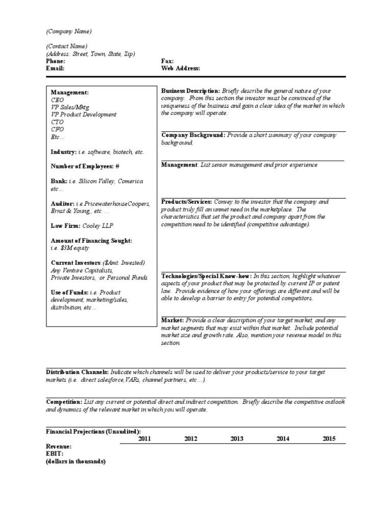 Executive Summary Template (updated) Angel Investor Tech Start Ups