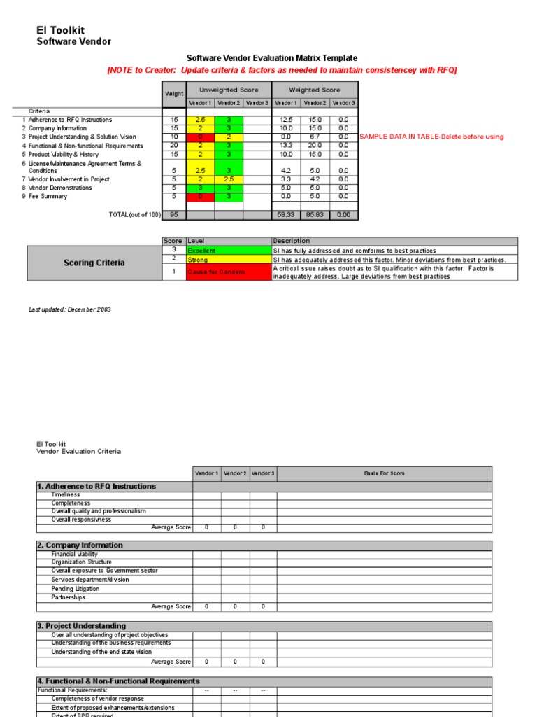 SW Vendor Evaluation Matrix Template Evaluation Technology